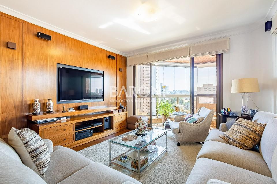 Apartamento de alto padrão à venda no Campo Belo, com 242 m², 4 dormitórios com varandas sendo 3 suítes, 3 vagas, portaria 24 horas blindada, espaço de lazer, próximo ao Metrô Campo Belo. Baroni Imóveis, imobiliária sediada em Moema.